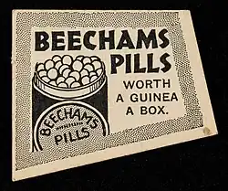 In August 1859, British pharmaceutical firm Beechams created a slogan for Beecham's Pills: "Beechams Pills: Worth a guinea a box", which is considered to be the world's first advertising slogan.[13] The Beechams adverts would appear in newspapers all over the world, helping the company become a global brand.[13][14] The phrase was said to be uttered by a satisfied lady purchaser from St Helens, Lancashire, the founder's hometown.[15]