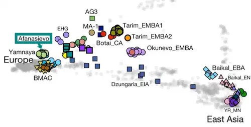 The analysis of the full genome of Afanasievo individuals has shown that they were genetically very close to the Yamnaya population of the Pontic–Caspian steppe.[8][46][47] The Afanasievo and Yamnaya populations were much more similar to each other than to groups geographically located between the two (which unlike Afanasievo samples carried a large amount of ancestry from eastern Siberian hunter-gatherers). This indicates that the Afanasievo culture was brought to the Altai region via migration from the western Eurasian steppe, which occurred with little admixture from local populations.[47][48]