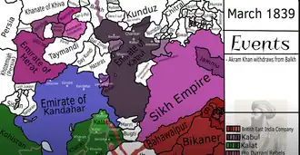 With the collapse of the Durrani Empire, and the exile of the Sadozai Dynasty to be left to rule in Herat, Punjab and Kashmir were lost to Ranjit Singh, ruler of the Sikh Empire, who invaded Khyber Pakhtunkhwa in March 1823 and captured the city of Peshawar following the Battle of Nowshera. In 1834, Dost Mohammad Khan led numerous campaigns, firstly campaigning to Jalalabad, and then allying with his rival brothers in Kandahar to defeat Shah Shuja Durrani and the British in the Expedition of Shuja ul-Mulk.[114] In 1837, Dost Mohammad Khan attempted to conquer Peshawar and sent a large force under his son Wazir Akbar Khan, leading to the Battle of Jamrud. Akbar Khan and the Afghan army failed to capture the Jamrud Fort from the Sikh Khalsa Army, but killed Sikh Commander Hari Singh Nalwa, thus ending the Afghan-Sikh Wars. By this time the British were advancing from the east, capitalizing on the decline of the Sikh Empire after it had its own period of turbulence following the death of Ranjit Singh, which engaged the Emirate of Kabul in the first major conflict during "The Great Game".[115]