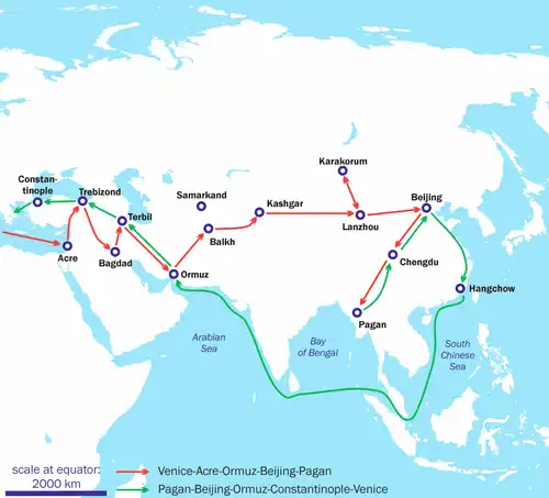 Christian embassies were sent as far as Karakorum during the Mongol invasions of the Levant, from which they gained a greater understanding of the world.[47][48] The first of these travellers was Giovanni da Pian del Carpine, dispatched by Pope Innocent IV to the Great Khan, who journeyed to Mongolia and back from 1241 to 1247.[44] Russian prince Yaroslav of Vladimir, and his sons Alexander Nevsky and Andrey II of Vladimir, travelled to the Mongolian capital. Though having strong political implications, their journeys left no detailed accounts. Other travellers followed, like French André de Longjumeau and Flemish William of Rubruck, who reached China through Central Asia.[49] Marco Polo, a Venetian merchant, dictated an account of journeys throughout Asia from 1271 to 1295, describing being a guest at the Yuan dynasty court of Kublai Khan in Travels. It was read throughout Europe.[50]