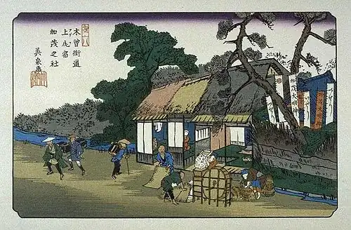 Keisai Eisen's ukiyo-e print of Ageo-shuku dates from 1835–1838. The inscription to the upper left corner mentions the Kamo Shrine, which was noted for its autumn festival. Votive banners for the shrine are depicted in the rear of the tea house, and are advertising "Takenouchi" and "Hoeidoh", the publishers of the series of prints. In front of the tea house are two men and two women in peasant's clothes, threshing grain. Two samurai travelers are on the road, and one merchant is heading in the opposite direction.