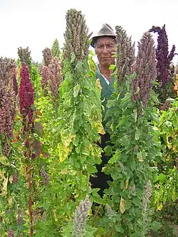 Diversity of quinoa (Chenopodium quinoa) near harvest, with quinoa farmer, in Cachilaya, Bolivia, Province La Paz
