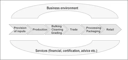 At the heart of the agricultural value chain concept is the idea of actors connected along a chain producing and delivering goods to consumers through a sequence of activities.[3] However, this “vertical” chain cannot function in isolation and an important aspect of the value chain approach is that it also considers “horizontal” impacts on the chain, such as input and finance provision, extension support and the general enabling environment. The approach has been found useful, particularly by donors, in that it has resulted in a consideration of all those factors impacting on the ability of farmers to access markets profitably, leading to a broader range of chain interventions. It is used both for upgrading existing chains and for donors to identify market opportunities for small farmers.[4]