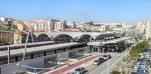 Agualva-Cacém Station opened on 2 April 1887 as the junction point between the Linha do Oeste and the Sintra Line between Alcântara-Terra and Sintra. The southern terminus of the Sintra Line was shifted to Rossio following that station's completion on 11 June 1890.[5] The station received an extensive modernization starting in 2007 as part of a Sintra Line renovation project.[6] The new station building was inaugurated on 6 May 2013, with the addition of quadruple tracks and another set of platforms.