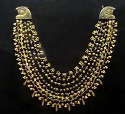 Ahhotep II was buried in Dra' Abu el-Naga and rediscovered in February 1859 by workmen employed by Auguste Mariette. The tomb contained her mummy (destroyed in 1859) and gold and silver jewelry. An inscribed ceremonial axe blade made of copper, gold, electrum and wood was decorated with a Minoan style griffin. Three golden flies were included and were awards usually given to people who served and acquitted themselves well in the army. A few items bore the name of Kamose, but more were inscribed with the name of Ahmose I.[4] A Gold armband in the form of a box and two lions were also found in her tomb.