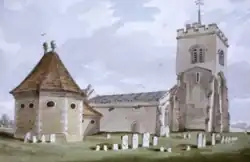 The Ailesbury Mausoleum consisted originally of a subterranean crypt with vaulted ceiling with an elongated octagonal shaped room above at ground level.[1] The crypt contained the Countess's coffin whilst the room above displayed her monument, in the form of an oval gadrooned cistern from which rises a half-figure of the Countess, sculpted in white marble (attributed to Thomas Burman), locally known as "the lady in the punchbowl".[1] The room was lit by oval windows and was linked by a short length of covered passage which led into the north side of the Church, in which was situated the manorial pew occupied by the Bruce family and its household servants. This original arrangement is illustrated in an early 19th-century watercolour painting now in the nearby Luton Museum and Art Gallery, which also shows the steeply pitched roof with alternating bands of plain and fish-scale clay tiles,[1] surviving today.