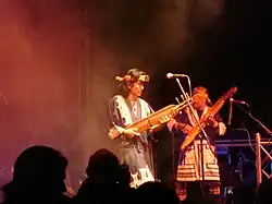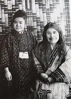 Intermarriage between Japanese and Ainu was actively promoted by the Ainu to lessen the chances of discrimination against their offspring. As a result, many Ainu today are indistinguishable from their Japanese neighbors, but some Ainu-Japanese are interested in traditional Ainu culture.[64] For example, Oki, born as the child of an Ainu father and a Japanese mother, became a musician who plays the traditional Ainu instrument, the tonkori.[65] There are also many small towns in the southeastern or Hidaka region of Hokkaido where ethnic Ainu live, such as in Nibutani (Niputay).