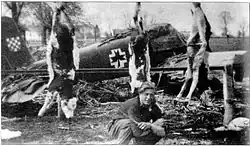 Despite these raids, the war's outcome had become apparent. Defections of ZNDH personnel and aircraft to the Allies and Partisans intensified, including two Bf 109s to Italy on 16 April and a further two Messerschmitts to the Partisans in Mostar on 20 April.[48] The last fighter delivery took place on 23 April 1945. It was also on this day that the final Croatian kills were scored when an ex-HZL 16-kill ace and his wingman claimed two RAF P-51 Mustangs shot down in their Bf 109Gs, one of which was confirmed. The last attack mission was flown on 6 May, when two antiquated Rogožarski R-100 fighter trainers bombed the railway bridge over the Kupa in an effort to stop the Partisan advance on Karlovac, south of Zagreb. One of the Yugoslav-built parasol wing aircraft was hit by ground fire and the pilot crash-landed near his target. He was captured and shot on the spot.[49]