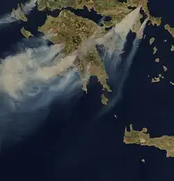 An annotated satellite photo showing smoke from wildfires in Greece, giving rise to an elevated AQI downwind
