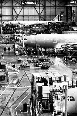In preparation for the production of the A330 and the A340, Airbus's partners invested heavily in new facilities. In south-western England, BAe made a £7 million investment in a three-storey technical centre with 15,000 m2 (161,000 sq ft) of floor area at Filton.[26] In north Wales, BAe also spent £5 million on a new production line at its Broughton wing production plant.[26] In Germany, Messerschmitt-Bölkow-Blohm (MBB) invested DM400 million ($225 million) on manufacturing facilities in the Weser estuary, including at Bremen, Einswarden, Varel, and Hamburg.[27] France saw the biggest investments, with Aérospatiale constructing a new Fr.2.5 billion ($411 million) final-assembly plant adjacent to Toulouse-Blagnac Airport in Colomiers; by November 1988, the pillars for the new Clément Ader assembly hall had been erected.[28] The assembly process featured increased automation, such as robots drilling holes and installing fasteners during the wing-to-fuselage mating process.[29]