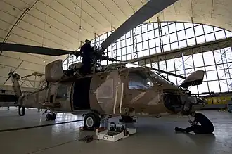 A United States Navy SH-60F Seahawk helicopter undergoing routine maintenance in 2005
