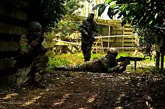 Airsoft gameplay varies in style and composition, but often ranges from action shooting to short organized live action role-playing (LARP) scenarios, close quarters battle skirmishes, military simulations (MilSim) or historical reenactments.[6] It is played in indoor courses or outdoor fields.[7] Combat situations on the field may involve the use of genuine military tactics to achieve objectives set in each game. Participants may attempt to emulate the tactical equipment and accessories used by modern military and police organizations. A game is normally kept safe by trained professionals acting as supervisors and marshals.[8]