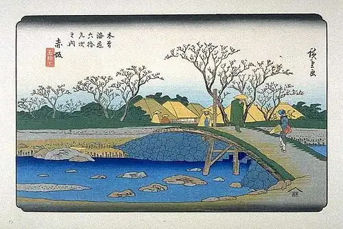 Utagawa Hiroshige's ukiyo-e print of Akasaka-juku dates from 1835 -1838. The print depicts travelers crossing a wooden bridge across a small river. The thatched roofs of Akasaka-juku are on the far side. The setting is either spring or fall, as the travelers are wrapped in cloaks against the chill.