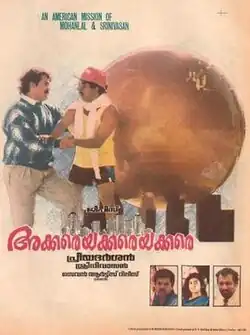 Akkareyakkareyakkare, also known Akkare Akkare Akkare (transl. Far Far Away) is a 1990 Indian Malayalam-language buddy cop comedy film directed by Priyadarshan and written by Sreenivasan. It stars Mohanlal, Sreenivasan, M. G. Soman, Mukesh, Maniyanpilla Raju, Parvathy and Nedumudi Venu in major roles. It is a sequel to 1987's Nadodikkattu and 1988's Pattanapravesham; Mohanlal and Sreenivasan reprises their roles. However, Thilakan, Mamukkoya and Innocent, who have appeared in the previous films, do not appear in this film. Also, a new cast of Nedumudi Venu, Sukumari, Parvathy Jayaram, Jagadish, Mukesh and Maniyanpilla Raju appears. M. G. Soman plays a character role, having appeared as himself in Nadodikkattu. The story follows C.I.Ds Dasan and Vijayan on an investigation for a gold crown stolen to the United States.[1]