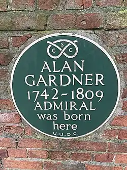 Gardner was born at the Manor House, Uttoxeter, which is commemorated by a plaque. He married Susannah Hyde Gale (2 May 1749 – 20 April 1823) in Kingston, Jamaica, on 20 May 1769.[10] She was a Jamaican heiress and the daughter of Francis Gale, a plantation owner, and Susanna Hall.[10] They had nine sons and a daughter. His eldest son, Alan Gardner, 2nd Baron Gardner, became an admiral in the Royal Navy; the second son, Francis, also became an admiral; and the third son William, became a major general.[11]