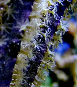Other fauna, such as hydrozoa, bryozoa, and brittle stars, are known to dwell within the branches of gorgonian colonies.[22] The pygmy seahorse not only makes certain species of gorgonians its home, but also closely resembles its host, thus is well camouflaged.[23] Two species of pygmy seahorse, Hippocampus bargibanti and Hippocampus denise, are obligate residents on gorgonians. H. bargibanti is limited to two species in the single genus Muricella.