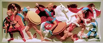 The relief carvings on one long side of the piece depict Alexander fighting the Persians at the Battle of Issus. Volkmar von Graeve has compared the motif to the famous Alexander Mosaic at Naples; he concludes that the iconography of both derives from a common original, a lost painting by Philoxenus of Eretria.[11] The comparison between the mosaic and sarcophagus has gained traction in the scholarly field, supported by other scholars such as Andrew Stewart.[12] Alexander is shown mounted, wearing a lion skin on his head, and preparing to throw a spear at the Persian cavalry. There remains debate surrounding the importance of the historicity of the figures seen in the hunting and battle scenes. While historians such as von Graeve interpret them as accurate portrayals of historic figures,[11] other historians like Schefold focus on them as mythic subjects of the battles and royal hunt.[6] Some scholars, as well, believe that a second mounted Macedonian figure near the center represents Hephaestion, Alexander's older close friend. A third mounted Macedonian figure is often identified as Perdiccas, one of the generals in Alexander's army.