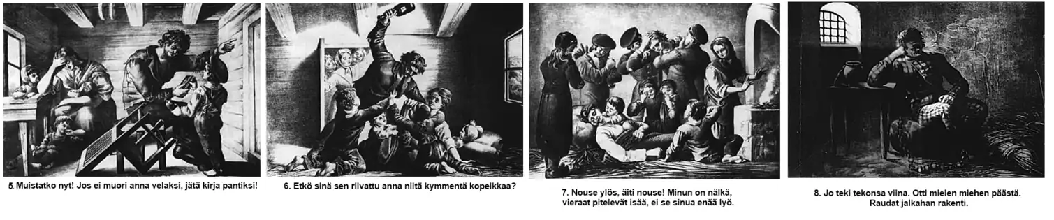In 1858, on Ekman's recommendation, she was asked to provide drawings for a publication by Raittiuden Ystävät (a Finnish temperance society), an anti-alcohol booklet called Turmiolan Tommin Elämäkerta ('The Life Story of Pernicious Tommy').[2] Her drawings were engraved by F. O. Liewendahl (fl.1850s-1860s) and the booklet was reissued for many years.[3] The story itself (by an unknown writer) came to be referenced in several popular songs, as recently as 1982 by the Finnish rock band Eppu Normaali.