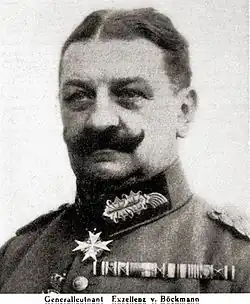 After Otto von Below became the commander of the 8th Army in November 1914, Böckmann was made Chief of the General Staff of the 8th Army, with which he participated in the Second Battle of the Masurian Lakes.[2] With the formation of the Army of the Niemen from units of the 8th Army, in May 1915, Böckmann became its chief of staff. When Otto von Below was transferred to the Macedonian front and became the commander of Army Group Below, Böckmann became the chief of staff of the said army group.[1] He remained the chief of staff of the army group even after Friedrich von Scholtz took over command of the same from Below.