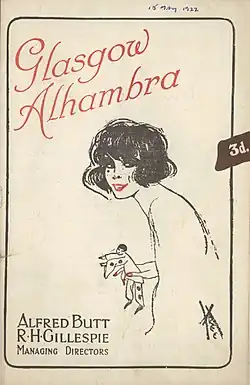 The Alhambra opened with Yvonne Guilbert from France and specialised in variety, including artistes from America, Australia and Continental Europe. Pantomimes began, using the Wylie-Tate production company. Scottish performers included Harry Lauder, Will Fyffe, Alec Finlay and Harry Gordon; revues and musical plays were added, featuring Cicely Courtneidge, Jack Buchanan, Evelyn Laye, Jessie Matthews and Ivor Novello; and also opera, ballet and dance. In 1941 it was the debut theatre of the International Ballet newly formed by Mona Inglesby.[4]