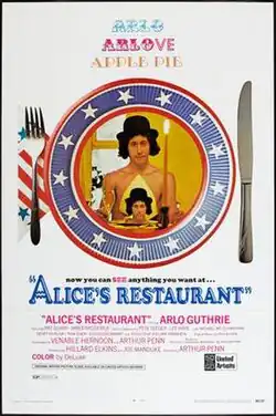 Alice's Restaurant is a 1969 American comedy film directed by Arthur Penn. It is an adaptation of the 1967 folk song "Alice's Restaurant Massacree", originally written and sung by Arlo Guthrie. The film stars Guthrie as himself, with Pat Quinn as Alice Brock and James Broderick as Ray Brock.[3] Penn, who resided in the story's setting of Stockbridge, Massachusetts, co-wrote the screenplay in 1967 with Venable Herndon after hearing the song and more of the story from Brock's father, who was on the board of directors at The Berkshire Playhouse,[4] and shortly after directing Bonnie & Clyde.[3]