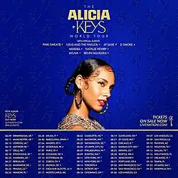 The Alicia + Keys World Tour was the sixth concert tour by American singer and songwriter Alicia Keys in support of her seventh and eighth studio albums Alicia (2020) and Keys (2021).[1][2] This is Keys' first global tour since her 2013 Set the World on Fire Tour.[3] The tour started on June 9, 2022, at the Utilita Arena in Birmingham, England, and is set to conclude on May 19, 2023, at the Telmex Auditorium in Mexico, South America, after 59 concerts in 20 countries and 3 continents.[a] Recordings from the concerts in São Paulo, Buenos Aires, Santiago, Bogotá and Mexico City were released as digital live albums. The tour earned nearly $35 million dollars from 51/59 shows in 2022. Keys performed 8 shows as part of the Latin American leg in 2023.