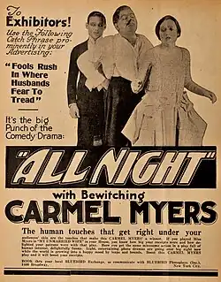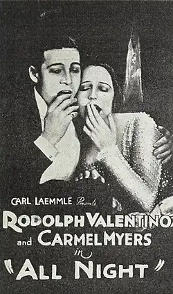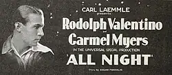 All Night is a 1918 American silent comedy-drama film directed by Paul Powell and starring Carmel Myers and Rudolph Valentino (credited as Rudolpho di Valentina). It was released by Universal Pictures under the name Bluebird Photoplays.[1]