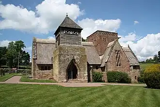 The body of the church is built of Red sandstone rubble. It consists of a nave, a porch surmounted by a bell tower, a crossing tower, north and south transepts and a chancel.[10] The roof construction is unusual for its time, the vaulting is unreinforced concrete, over which Lethaby placed a thatched roof.[11] The concrete allows for sweeping pointed arches in local stone which rise almost from floor level and run the length of the nave.[1] Lethaby's inspiration for the arches has been debated by architectural historians. Simon Jenkins sees parallels with Edward Schroeder Prior's St Andrew's Church, Roker and also with work by Frank Lloyd Wright;[2] while Alan Brooks, in the 2012 revision to the Herefordshire volume of the Buildings of England, notes similarities to work by Lethaby's teacher, Norman Shaw at Adcote but also to genuine medieval French and Catalan abbeys, such as the monastery at Poblet.[b][3]