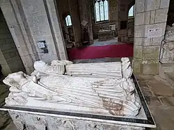 The set of alabaster monuments are described as being "the glory of the church";[1] they consist of the effigies of six recumbent couples lying on tomb chests, and all depict members of families connected with the Harewood estate.[1] All the monuments were originally brightly coloured, but the colour has been lost, leaving the white alabaster. A major programme of conservation was carried out in 1978 when they were dismantled and reerected as close as possible to their original locations.[10] On the sides of the tombs are depictions of angels, saints and mourners.[7] The oldest tomb, in the south chapel, is that of Sir William Gascoigne, Lord Chief Justice and his wife Elizabeth; it dates from about 1419.[1] Sir William is dressed in his robes and he carries a purse and a dagger. The later tombs display a greater sophistication in their carving, and they reflect the fashions of the day.[2] The latest effigies are of Edward Redman (Redmayn)[11] and his wife Elizabeth Huddleston, dating from about 1510; the depiction of Edward Redman is said to be a true-to-life portrait, a rarity at the time it was carved.[12]