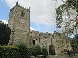 The church is built of limestone and sandstone, with roofs of stone flags. It consists of a nave with a clerestory, north and south aisles, a south porch, a chancel with a north Lady Chapel and a south vestry, and a west tower. The tower has three stages, diagonal buttresses, string courses, glazed oculi, two-light bell openings, a clock face, and an embattled parapet with crocketed pinnacles. There are also embattled parapets on the body of the church. The porch has two storeys, with a room in the upper floor, and a tunnel vault, and the inner doorway has a round-arched head in a segmental arch. Inside, there is a 14th-century sedilia, a Jacobean reredos in the Lady Chapel, a pulpit and screen designed by Scott, and a chancel screen by Temple Moore. There is a brass memorial to Lady Brooke, who died in 1600.[2][3]