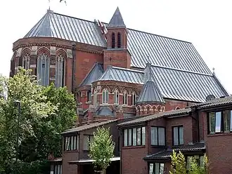 On 9 June 2000, the building's interior was destroyed in a fire.[7] Restoration work was completed in April 2006, providing the western end of the church with a modern entrance that contrasts with the Gothic architecture of the remainder of the building. Though the church organ was destroyed in the fire, it was later replaced in the summer of 2011 by a 1969 organ that was previously in the chapel at St Paul's School in Barnes.[8][9]