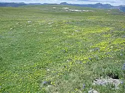 Alpine areas are unique because of the severity and complexity of their environmental conditions. Very small changes in topography – as small as 1 foot (0.3 m) or less – may mean the difference between a windswept area or an area of snow accumulation, changing the potential productivity and plant community drastically. Between these extremes of drought versus saturation, several intermediate environments may exist all within a few yards of each other, depending on topography, substrate, and climate. Alpine vegetation generally occurs in a mosaic of small patches with widely differing environmental conditions. Vegetation types vary from cushion and rosette plants on the ridges and in the rock crannies; to herbaceous and grassy vegetation along the slopes; dwarf shrubs with grasses and forbs below the melting snowdrifts; and sedges, grasses, low shrubs, and mosses in the bogs and along the brooks.[7]