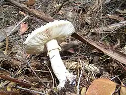 The fruit body has a white or cream cap, which is convex and rounded when young and opening out and flattening to flat-convex or flat to around 8 centimetres (3 inches) in diameter. It is covered in large irregular patches of the veil, also coloured cream.[3] These often hang over the edge of the cap and fragments can litter the ground near the mushrooms.[4] The crowded white gills are free. The stipe is up to 12 cm (4+1⁄2 in) high and 2 cm wide. The fragile ring is often present in younger mushrooms, but falls off. The swollen base of the stipe is smooth.[3] The flesh is white and has a mealy smell.[4]