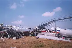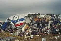 The aircraft continued past the end of the runway, traveling another 800 feet (240 m; 270 yd), and striking a security fence and an ILS localizer array. The aircraft then collided with a structure built to support the approach lights for Runway 22L, which extended out into the Arkansas River.[1]: 43  Such structures are usually frangible, designed to shear off on impact, but because the approach lights were located on the unstable river bank, they were firmly anchored.[1]: 159  The collision with the sturdy structure crushed the airplane's nose, and destroyed the left side of the plane's fuselage, from the cockpit back to the first two rows of coach seating.[1]: 159  The impact broke the aircraft apart into large sections, which came to a rest short of the river bank.[1]: 43