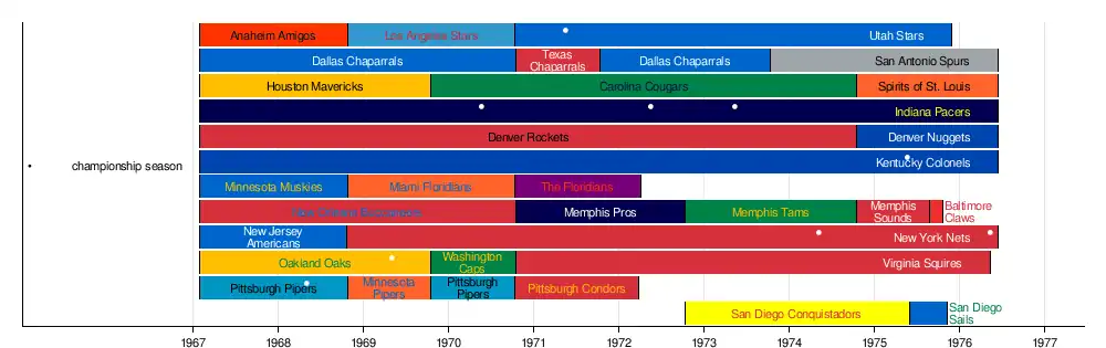 9 New York Americans 1967 Joined the NBA, 1976, name changed to reflect move to New Jersey (1977), known as Brooklyn Nets since 2012.