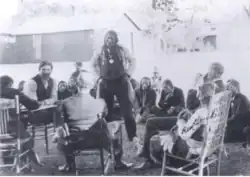 Chief American Horse was always welcome guest at The Wigwam, Major Israel McCreight's home in Du Bois, Pennsylvania. The Wigwam was a retreat for Progressive Era politicians, businessmen, journalists and adventurers; the Eastern home of Oglala Lakota "Oskate Wicasa"; Chief Flying Hawk's second home for 30 years and a Native American heritage center. Du Bois, a northcentral railroad hub on the Eastern Continental Divide, was always a welcome rest stop for weary travelers.[55] Wild Westers needed a place to relax, and The Wigwam was a warm and welcome home where Indians could be Indians, sleep in buffalo skins and tipis, walk in the woods, have a hearty breakfast, smoke their pipes and tell of their stories and deeds. On one occasion 150 Indians with Buffalo Bill's Wild West camped in the forests of The Wigwam. Chiefs American Horse, Blue Horse, Jim Grass, Whirlwind Horse, Turkey Legs, Lone Bear, Iron Cloud, Bear Dog, Yellow Boy, Rain-In-The-Face, Hollow Horn Bear, Kills-Close-To-Lodge, Red Eagle, Good Face (Eta Waste), Benjamin Brave (Ohitika) and Thunder Bull visited The Wigwam. Legendary Crow Chiefs Plenty Coups and Crow Dog were also welcome visitors. On June 22, 1908, McCreight was adopted as an honorary Chief of the Oglala Lakota people and named "Cante Tanke ("Great Heart"). On that occasion, Col. William "Buffalo Bill" Cody was in Du Bois, Pennsylvania, with Wild West Congress of Rough Riders. Twelve thousand people a day attended Cody's Wild West performances and 150 Oglalas were in town with 150 ponies. The ceremony was performed by Chief Iron Tail assembled at Buffalo Bill's tent and attended by Chief American Horse, Chief Lone Bear, Chief Whirlwind Horse, and 100 Oglala Lakota Wild Westers.[56]