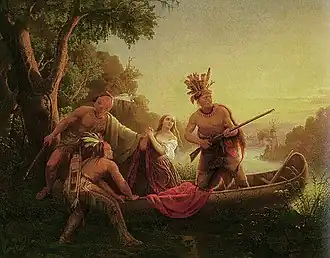 In several instances, the conflicts were a reflection of European rivalries, with Indian tribes splitting their alliances among the powers, generally siding with their trading partners. Various tribes fought on each side in King William's War, Queen Anne's War, Dummer's War, King George's War, and the French and Indian War, allying with British or French colonists according to their own self interests.[6] On 14 August 1784, Russian colonists had massacred 200[7]–3,000 [8] Koniag Alutiiq tribesmen in Sitkalidak Island, Alaska. This massacre is known as Awa'uq Massacre. Despite the incidents that occurred between European colonists and the Native population, most Indian tribes were friendly towards the Swedes in New Sweden as result of Swedish authorities respecting tribal land.[9]