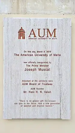 - ^ a b "AUM Opens its Doors to the First Batch of Students". maltachamber.org.mt. 12 September 2017. Archived from the original on 1 December 2017. Retrieved 29 November 2017.