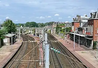 The railway from Amiens to Rouen is a French 114-kilometre long railway line, that connects Amiens to Rouen. It was opened in 1867.[3] The line was electrified on 27 August 1984 at 25 kW 50 Hz, and was equipped with the restrained permissivity automatic blocking system, which since the 1990s has offered increasingly unsatisfactory operating conditions with respect to the increasing mixed passenger and goods traffic on the line.