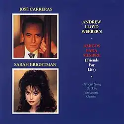 "Amigos Para Siempre (Friends for Life)", also called "Amics per sempre" in Catalan, is a song recorded by British soprano Sarah Brightman and Spanish tenor José Carreras, with music composed by Andrew Lloyd Webber and lyrics written by Don Black. It was one of the two official theme songs of the 1992 Summer Olympics held in Barcelona, Spain.