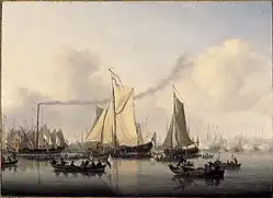 In September 1816 the British steamboat Defiance visited Amsterdam, but met little local enthusiasm.[2] The lack of support for steam navigation in Amsterdam is explained by that it threatened the vested interests of the Amsterdam merchants. There were however also genuine concerns about the net price for transport getting higher, and about the continuity of service. [3]