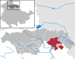 An der Schmücke (German pronunciation: [an deːɐ̯ ˈʃmʏkə], lit.'On the Schmücke') is a town in the district Kyffhäuserkreis, in Thuringia, Germany. It was created with effect from 1 January 2019 by the merger of the former municipalities of Bretleben, Gorsleben, Hauteroda, Heldrungen, Hemleben and Oldisleben. Between 1993 and 2019, these municipalities were part of the Verwaltungsgemeinschaft ("collective municipality") An der Schmücke, which additionally contained the municipalities Etzleben and Oberheldrungen. The seat of the town and the former Verwaltungsgemeinschaft is in Heldrungen.