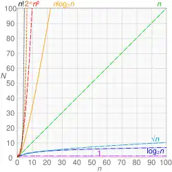 Graphs of functions commonly used in the analysis of algorithms, showing the number of operations N versus input size n for each function