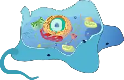 Unlike plant cells, animal cells have neither a cell wall nor chloroplasts. Vacuoles, when present, are more in number and much smaller than those in the plant cell. The body tissues are composed of numerous types of cells, including those found in muscles, nerves and skin. Each typically has a cell membrane formed of phospholipids, cytoplasm and a nucleus. All of the different cells of an animal are derived from the embryonic germ layers. Those simpler invertebrates which are formed from two germ layers of ectoderm and endoderm are called diploblastic and the more developed animals whose structures and organs are formed from three germ layers are called triploblastic.[17] All of a triploblastic animal's tissues and organs are derived from the three germ layers of the embryo, the ectoderm, mesoderm and endoderm.