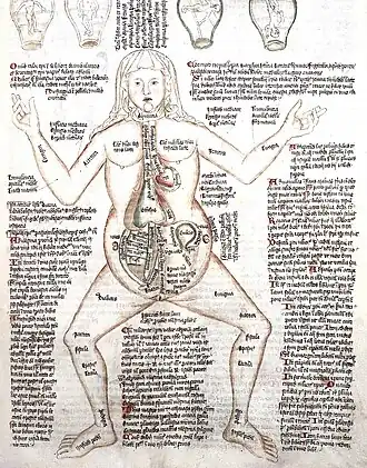 Some of the most striking advances in early anatomy and physiology took place in Hellenistic Alexandria.[61] Two of the most famous anatomists and physiologists of the third century were Herophilus and Erasistratus. These two physicians helped pioneer human dissection for medical research, using the cadavers of condemned criminals, which was considered taboo until the Renaissance—Herophilus was recognized as the first person to perform systematic dissections.[62] Herophilus became known for his anatomical works, making impressive contributions to many branches of anatomy and many other aspects of medicine.[63] Some of the works included classifying the system of the pulse, the discovery that human arteries had thicker walls than veins, and that the atria were parts of the heart. Herophilus's knowledge of the human body has provided vital input towards understanding the brain, eye, liver, reproductive organs, and nervous system and characterizing the course of the disease.[62] Erasistratus accurately described the structure of the brain, including the cavities and membranes, and made a distinction between its cerebrum and cerebellum[64] During his study in Alexandria, Erasistratus was particularly concerned with studies of the circulatory and nervous systems. He could distinguish the human body's sensory and motor nerves and believed air entered the lungs and heart, which was then carried throughout the body. His distinction between the arteries and veins—the arteries carrying the air through the body, while the veins carry the blood from the heart was a great anatomical discovery. Erasistratus was also responsible for naming and describing the function of the epiglottis and the heart's valves, including the tricuspid.[65] During the third century, Greek physicians were able to differentiate nerves from blood vessels and tendons[66] and to realize that the nerves convey neural impulses.[61] It was Herophilus who made the point that damage to motor nerves induced paralysis.[62] Herophilus named the meninges and ventricles in the brain, appreciated the division between cerebellum and cerebrum and recognized that the brain was the "seat of intellect" and not a "cooling chamber" as propounded by Aristotle[67] Herophilus is also credited with describing the optic, oculomotor, motor division of the trigeminal, facial, vestibulocochlear and hypoglossal nerves.[68]