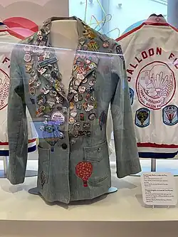 From Women's Contributions: Denim Jacket covered in commemorative Balloon Pins, worn by Carol Kinney, the first Balloonmeisterin for the Albuquerque International Balloon Fiesta, 1982.