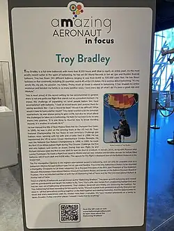Some information about Troy Bradley's feats and contributions. As of Summer 2022 a yellow flight jacket of Bradley's was also displayed, with many highly specific and unique patches. Troy Bradley has spent over a day of flight hours with hot air balloons cumulatively, and has flown over 241 balloons of varying size.