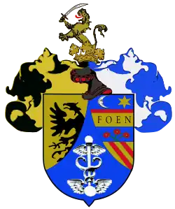 Andrei the elder was killed in mysterious circumstances before he could receive his diploma, but this was granted to his wife.[7] The more senior branch established by them became known as Mocioni de Foen, or fényi Mocsonyi, in reference to its core estate of Foeni (Fény). This was by contrast with Mihai's descendants, the armalist Mocionis, who did not hold a titular estate—although they built a manor at Marosberkes (now Birchiș, Romania), they were mostly based in Pest, where they founded the Kefala Library.[8] Andrei the second was a grandson of the original Andrei, born to lawyer Ioan Mocioni de Foen (1780–1854) and his wife Iuliana Panaiot (1787–1858).[9] On his mother's side, Andrei had Albanian roots.[10][11] He had an elder brother, Petru, born in 1808, and two junior ones: Anton and Gheorghe (born 1816 and 1823, respectively).[12] Other siblings included brothers George and Lucian (the latter of whom died young) and sister Ecaterina.[10][11][13] Ioan and Iuliana together had as many as 11 other children.[14] Andrei was simultaneously the uncle and cousin of writer Alexandru Mocioni, born from a consanguine marriage between Ecaterina and her uncle Mihai Mocioni.[11][15]