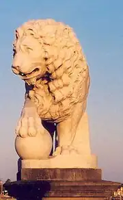 - Marble lions at the base of the Bridge of Lions (carved by F. Romanelli) one a replica of a Roman original the other a copy of one carved by Flaminio Vacca to copy the Roman original except with the opposite paw on the ball, both are on display at Loggia dei Lanzi in Florence, Italy.