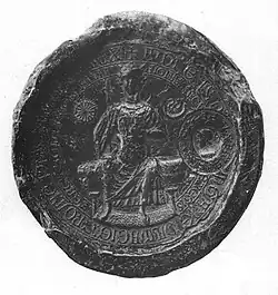 John, Archbishop of Kalocsa, crowned Andrew king in Székesfehérvár on 29 May 1205.[11][45] Andrew introduced a new policy for royal grants, which he called "new institutions" in one of his charters.[46][47] He distributed large portions of the royal domain—royal castles and all estates attached to them—as inheritable grants to his supporters, declaring that "the best measure of a royal grant is its being immeasurable."[47][48] His "new institutions" altered the relations between the monarchs and the Hungarian lords. During the previous two centuries, a lord's status primarily depended on the income he received for his services to the monarch; after the introduction of the "new institutions", their inheritable estates yielded sufficient revenues.[1] This policy also diminished the funds upon which the authority of the ispáns, or heads, of the counties—who were appointed by the monarchs—had been based.[49]